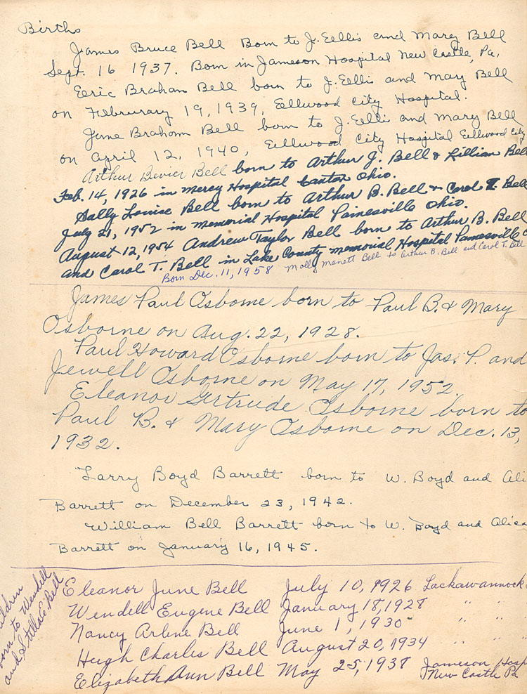 James Bruce Bell Born to J. Ellis and Mary Bell Sept. 16 1937. Born in Jameson Hospital New Castle, Pa. Eric Braham Bell born to J. Ellis and Mary Bell on February 19, 1939, Ellwood City Hospital June Braham Bell born to J. Ellis and Mary Bell on April 1 Arthur Bevier Bell born to Arthur J. Bell & Lillian Bell Feb. 14, 1926 in Mercy Hospital Canton Ohio. Sally Louise Bell born to Arthur B. Bell & Carol L. Bell July 21, 1952 in Memorial Hospital Painesville Ohio. August 12, 1952 Andrew Taylor Bell born to Arthur B. Bell and Carol L. Bell in Lake County memorial Hospital Painesville Born Dec. 11, 1958 Moll James Paul Osborne born to Paul B. & Mary Osborne on Aug. 22, 1928.  Eleanor Gertrude Osborne born to Paul B. & Mary Osbourne on Dec. 13, 1932. Paul Howard Osborne born to Jas, P. and Jewell Osbourn on May 17, 1952. Larry Boyd Barrett born to W. Boyd and Alice Barrett on December 23, 1942. William Bell Barrett born to W. Boyd and Alice Barrett on January 16, 1945. Eleanor June Bell July 10, 1926 Lackawannock Wendell Eugene Bell January 18, 1928 Nancy Arlene Bell June 1, 1930 Hugh Charles Bell August 20, 1934 Elizabeth Ann Bell May 25, 1938 Jameson Hosp New Castle PA