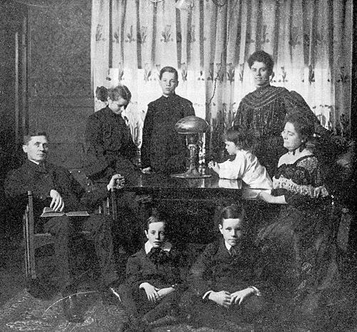 Upper row: Father (Archie), Alice, Miles, Nettie, Mother (Nettie) holding Wilhelmina Sitting on floor: Archie, Bayard |