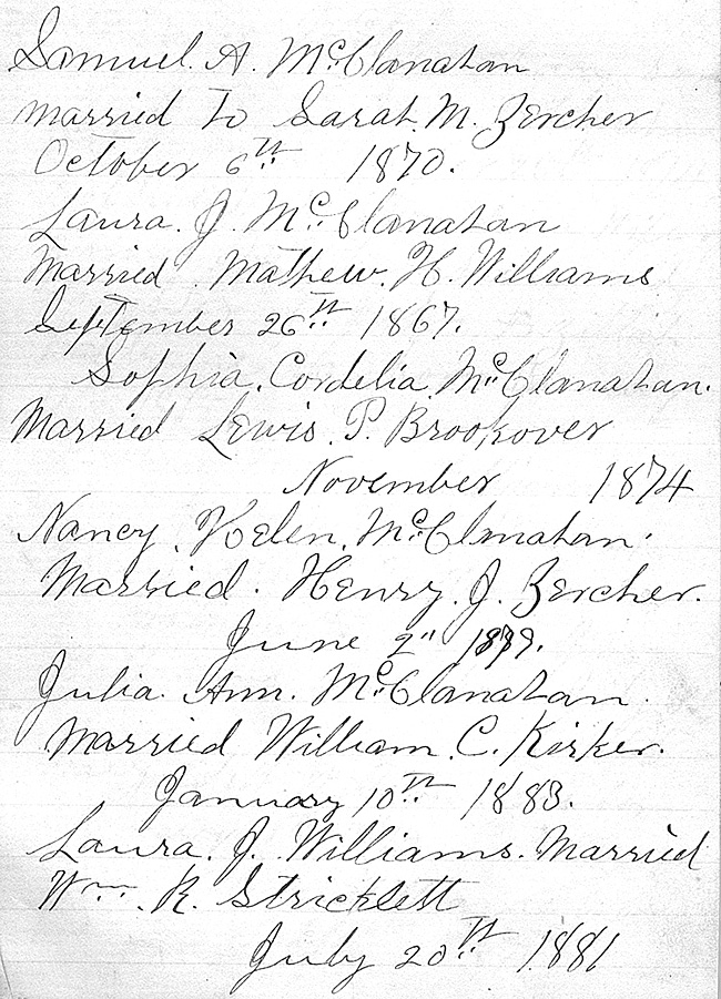 Samuel A. McClanahan married to Sarah M. Zercher October 6th 1870. Sophia Cordelia McClanahan Married Lewis P. Bookover November 1874 Nancy Helen McClanahan Married Henry J. Zercher June 2nd 1878. Julia Ann McClanahan Married William C. Kirker January 10th 1883. Laura J. Williams Married Wm. R. Stricklett July 20th 1881 Laura J. McClanahan Married Mathew H. Williams Septyember 26th 1867.