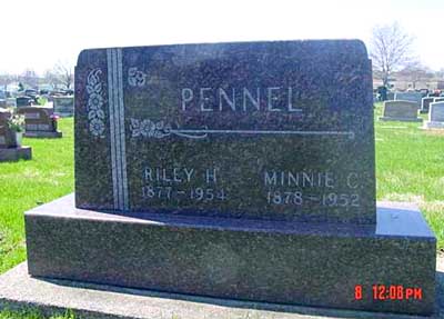 F1 Riley Hancock Pennell, born June 29, 1877 in Cass County, Indiana to Samuel Pennell and Ruth Ann Naylor. He died in 1954 in Peru Miami County Indiana. He was buried in Peru Mount Hope Cemetery Peru Twp., Miami County, Indiana . He was a general Merchandiser and later a traveling salesman and confectionary Broker.Riley Hancock Pennell and Wilhemina C. (Minnie) Nelson were married on 20 March 1901 in Marion County, Indiana. Wilhemina C. (Minnie) Nelson (daughter of Gustave August Nelson and Mary O.) was born on November 1878 in Indiana. She died in 1952 in Peru Mount Hope Cemetery Peru Towmship., Miami County, Indiana, and was buried in Peru Mount Hope Cemetery Peru Twp., Miami County, Indiana . Minnie was a school teacher.